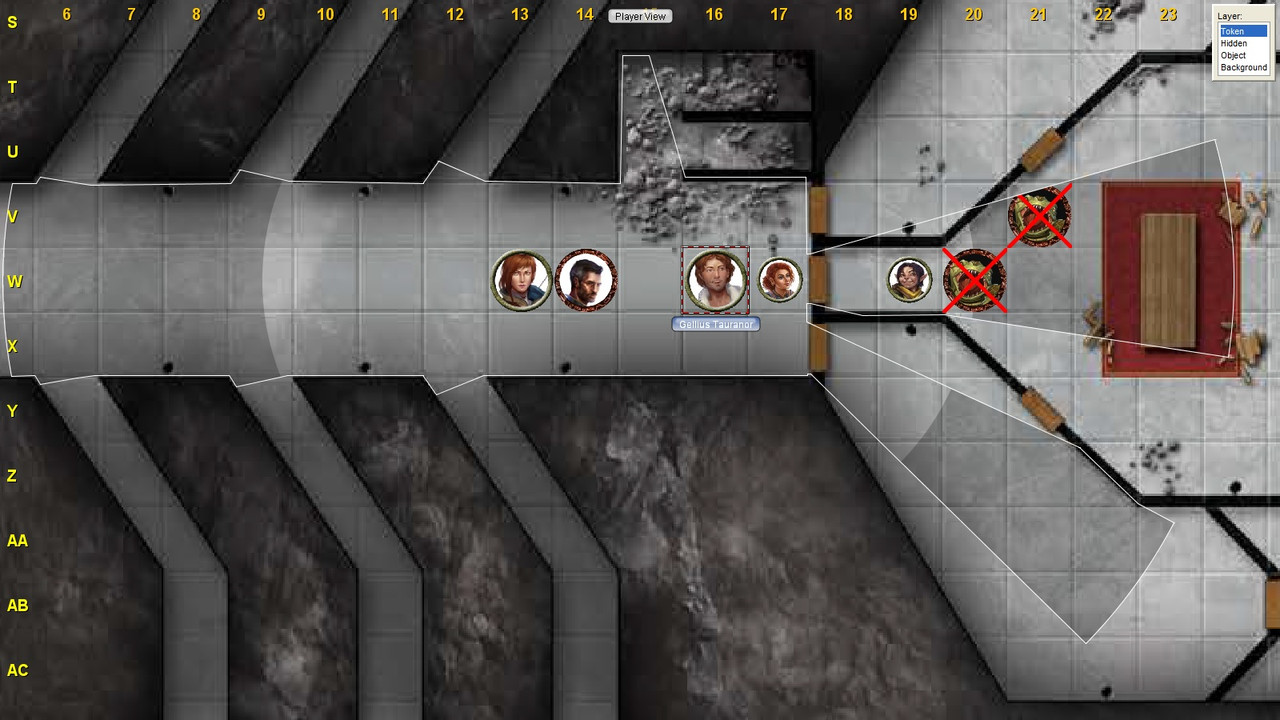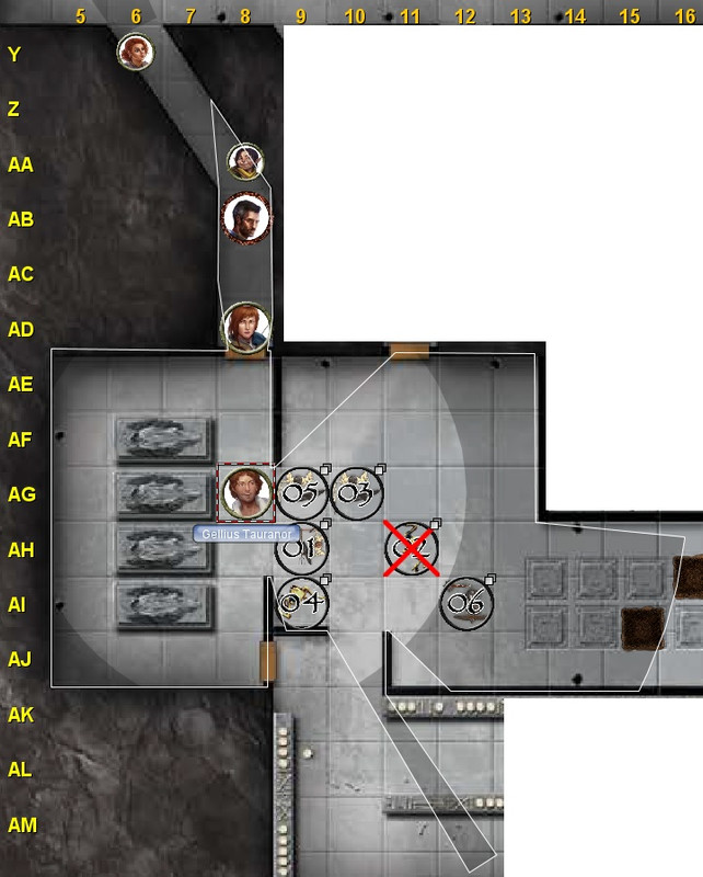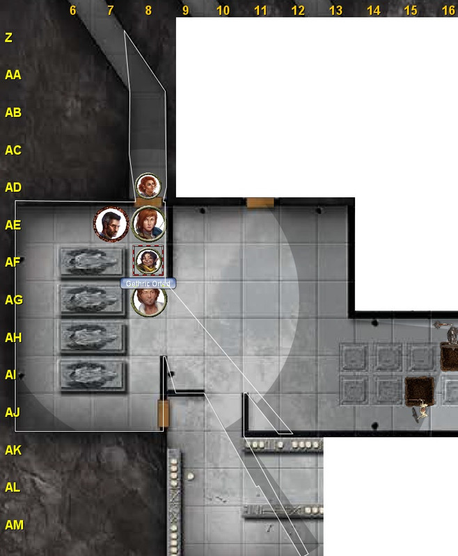 Alek calls out from back in the vaultway: "There! Under the table! Some sort of tiny ... man?" Alek Seeks: success, Points Out: W23, & Recalls Knowledge Round 1 init: Gethric, Alek, Gellius, Darla, ??, Aronida Current effects: light (Gellius, Alek)
