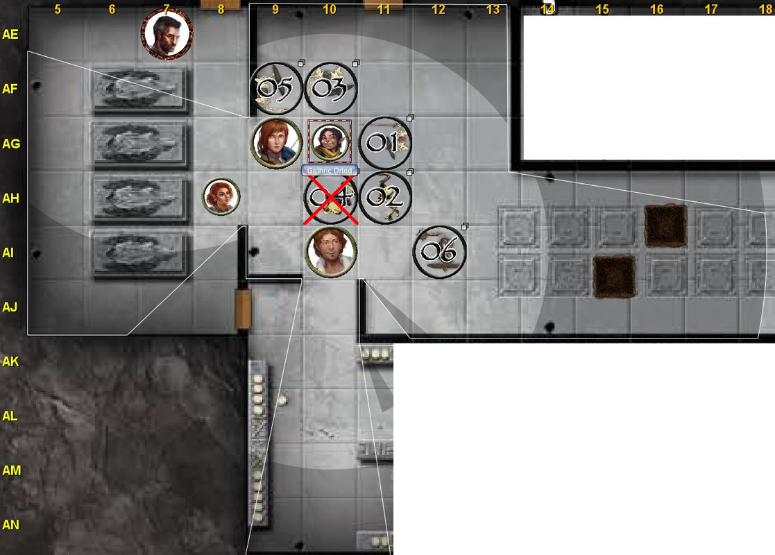 Alek blanches. "Power and glory," he mutters. "I never knew.... Listen! There has been a tomb robber. There's an old ward to protect the Hall of Graves from necromancy. I didn't know it was still active here.... They were volunteers! Their last act of service to the order would be to destroy those who would raise the fallen...." Alek Recalls Knowledge Round 1 init: Alek, Gethric, ??, Darla, ??, Gellius, ?? Aronida Current effects: continual flame (Alek)