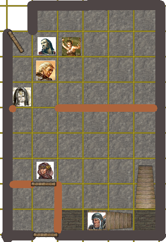 Smeed is about 40 feet away, but the stairs wind along the edge of the room and it will take him a double move to get there. I will use the same initiative rolls for you
