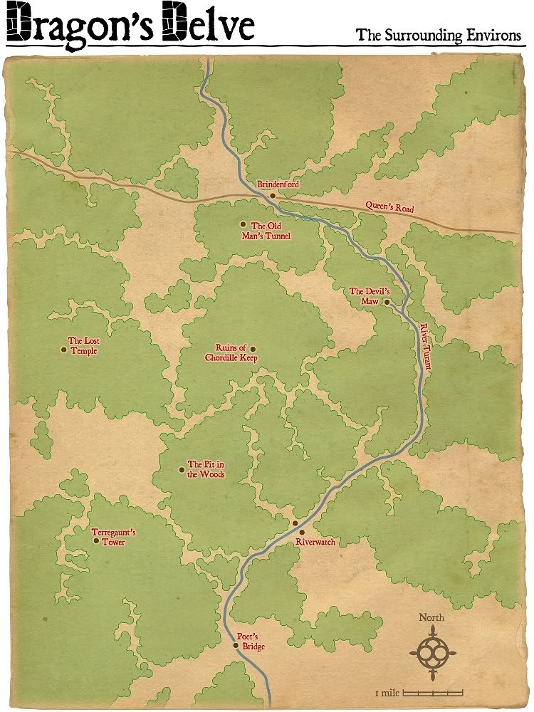 Maybe you first heard the name in a tavern well after closing time, as two old adventurers, well past their prime, spoke of it in hushed tones. Maybe it was from your own mother, who swore she'd send you there when you misbehaved. Perhaps you read the name in an ancient tome of history and lore illuminated by flickering candlelight late at night as the wind howled outside. Wherever you first heard of the place, you have long heard tales of Dragon's Delve. A vast underground dungeon of labyrinths and catacombs, built perhaps by dwarves or perhaps by wizards--or maybe even dragons--Dragon's Delve is infamous among treasure-hunters and monster-slayers. Filled with deadly danger and ancient treasures, the dungeon offers both risk and reward in equal amounts, each growing more intense the deeper one goes. How much peril is worth risking for how much return? It's all up to those brave enough to try. The tales of Dragon's Delve teem with contradictions and unbelievable anecdotes of impossible encounters and bizarre monstrosities. And yet, some of it all must be true. Do demonic cultists really use Dragon's Delve as a secret base? Is there truly some kind of ambient magic seeping up through the place? Did wizards of old hoard away powerful artifacts in the dungeon's vaults? Do gateways to remote lands and even other planes of existence really lie somewhere in Dragon's Delve? Does the prince of all dragonkind really hold court in the deepest reaches of the subterranean stronghold? No one knows for certain, but those that could find the answers to even some of these questions, or learn even a few of the dungeon's other secrets, might earn for themselves notoriety and wealth beyond imagining. If they survive. Dragon's Delve lies in a remote corner of a long-forsaken wilderness that people once called the Duchy of Chordille. Yet a hundred years ago or so, the folk of the surrounding lands took up arms against Chordille. They razed the keep and slew the duke. It's hard now to find someone who knows the real reason why this happened. A few speak of evil intent on the part of the duke, who had plans for conquest. Others, however, say that the duke's actions were always benevolent, and that the conflict arose from misunderstanding, or perhaps deception on the part of some mysterious third party. All that is known for certain is that folks call that remote realm the Fallen Duchy. It boasts no ruler and little population. Wilderness reclaimed Chordille, and it is now a land of dangers. People in Brindenford, a small town just two miles to the north, claim that murderous humanoid creatures prowl those ruins. Goblins? Orcs? Worse? No one seems to know for sure, and eyewitness accounts are few, and always contradictory. They also claim that the place is both haunted and cursed. So many questions. So many secrets. If you dare to brave this ancient dungeon, go well equipped. Be ready for anything. Keep your eyes open, and search everywhere. Any passage or door you find could lead to wealth enough for you to retire. Or it could lead to certain doom. But that's what being an adventurer is all about, right? This isn't an undertaking that you'll finish in one foray or even a dozen. This is the challenge of a lifetime. As someone thrilled at the prospect of exploring the unknown, incredible challenges, and the promise of gold and magic, Dragon's Delve is exactly where you've always wanted to go. The Surrounding Environs: