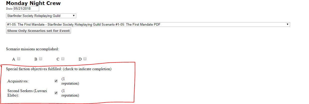 SFS 01-05 The First Mandate has a "Special Faction Objective" checkbox, because it awards additional "Reputation" based on your actions in the scenario. SFS 01-29 Honorbound Emissaries likewise will reward you with additional "Reputation" if you complete the success conditions, however, it is missing the "Special Faction Objective" checkbox. (This is also true of several other recent scenarios). Why is this checkbox missing from this scenario's reporting? Can we get it added?