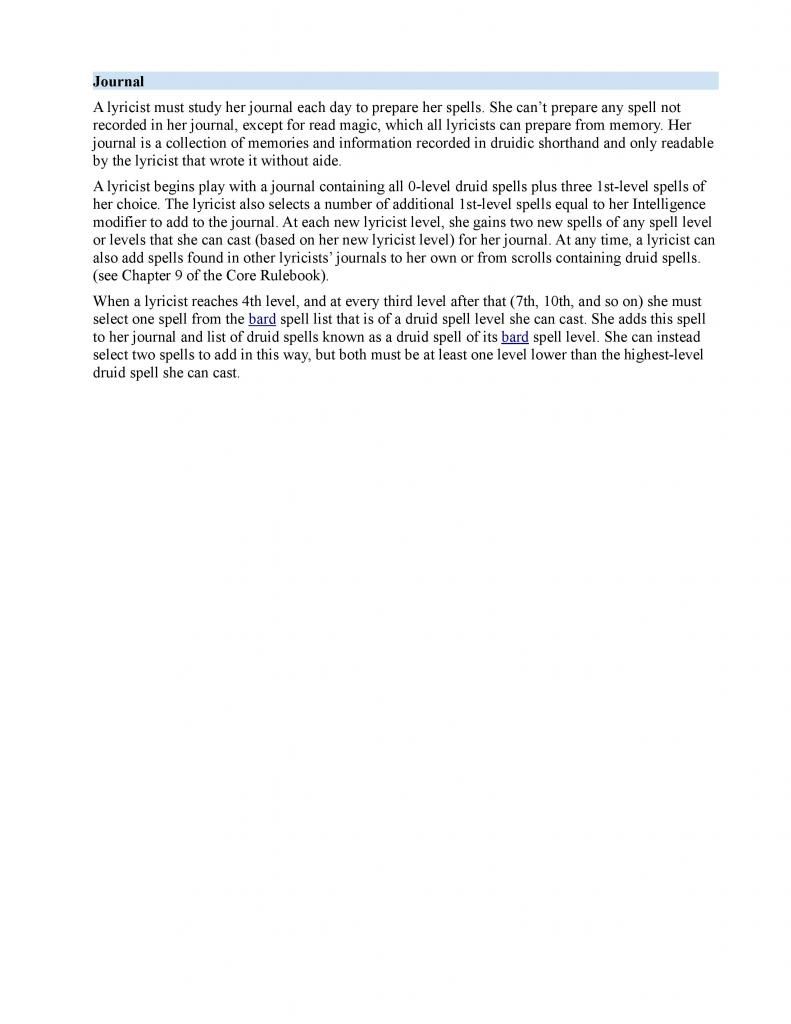 A lyricist begins play with a journal containing all 0-level druid spells plus three 1st-level spells of her choice. The lyricist also selects a number of additional 1st-level spells equal to her Charisma modifier to add to the journal. At each new lyricist level, she gains two new spells of any spell level or levels that she can cast (based on her new lyricist level) for her journal. At any time, a lyricist can also add spells found in other lyricists’ journals to her own or from scrolls containing druid spells. (see Chapter 9 of the Core Rulebook).