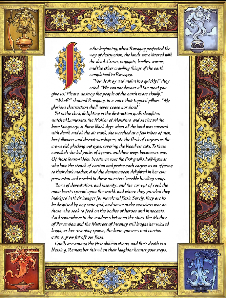 The eastern cloister walk abuts what must be the outer wall of the monastery itself. The lengthy wall bears a marred sculpture depicting the five figures from the north cloister mural in battle against numerous creatures of evil demeanor. Several of the creatures appear to be composed at least partly of fire, while others are much more difficult to define, being outright monsters of unknown origin or unusual warriors with weapons bonded into their flesh like organic tools. In the background Pale Mountain looms large, and over it two titanic figures lock in a deadly wrestler’s embrace. One has the demoniac visage of a noble efreeti, while the other is a gorgeous woman who could only be a djinni princess. Opposite the sculpted wall, a series of open arches leads out into an open-air courtyard. West Cloister: