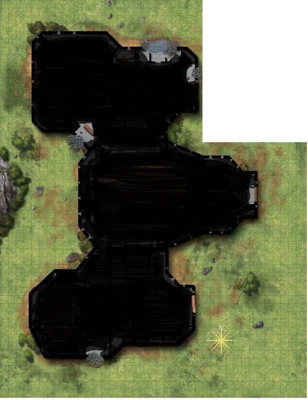 ![]() When the group is ready, Warbal leads them through the graveshells' puddle, back outside the citadel, and north down its side wall. From there, they follow her across the open ground to where the back side of Hellknight Hill begins to descend. She scrambles down a rough foot trail for a few meters, then stops. "Here is the Bumblebrashers' way in," she announces. With a bit of squinting, a well-hidden door can be discerned, covered with rough stone that matches the natural rock of the area and behind tall grass and brush. If you look at the old overall map from Aronida and Gethric's scouting excursion, you can actually see the S for the secret door that I forgot to hide a little less than halfway down on the left edge. :) ![]()