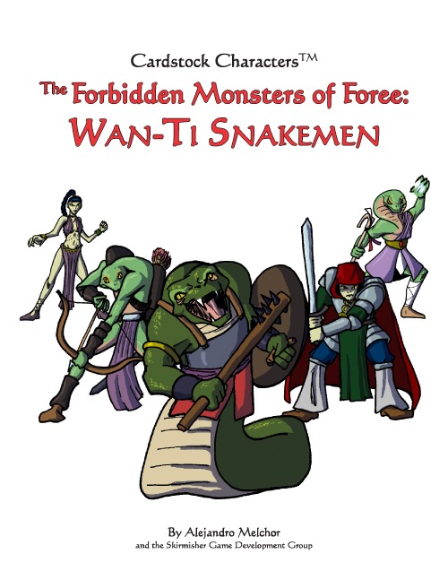 Cardstock Characters—Forbidden Monsters of Foree: Wan-Ti Snakemen PDFSkirmisher PublishingBehold the strange and terrible world of Foree! Awful and nonsensical are the rules of this inhospitable new world, where wizards alone reserve the right to utter the names of certain monsters. But we have dared to mention here the name of one of these fell creatures, the Wan-Ti Snakemen, and to present its fearful likenesses for your consideration. Although used to populate the world of Foree with no acknowledgement to their true creators, the Wan-Ti are in reality the shadowy and sinister snakemen of H.P. Lovecraft, Robert E. Howard, and other masters of dark fantasy. Dwelling in jungles, ruins, and subterranean vaults, sometimes directing the activities of insane cultists and minions, these ancient and ominous creatures wield powerful poisons and magicks in their ongoing attempts to suborn, manipulate, and corrupt humanity. They are the children of Set, and their brethren lurk in the shadows of Asian, Indian, Egyptian, and Central and South American folklore and mythology. This set of 20 full-color paper miniatures is designed to be compatible with other 25/30mm figures and contains 16 different creatures, 12 of them scaled to be approximately man-sized and four of them scaled as both somewhat larger than man-sized and as giant-sized creatures. All can be printed out and assembled as many times as desired.