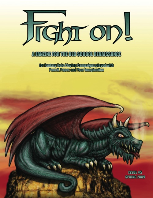 Fight On! Issue #5 Spring 2009 (1E) PDFFight On!The premiere fanzine of the old-school renaissance rolls into its second year of publication, battling harder than ever! Joining original Dragon Magazine editor Tim Kask in this issue are Jeff Rients, Lee Barber, Judd Karlman, Gabor Lux, Kelvin Green, Vincent Baker, David Bowman, Michael Curtis, Frank Farris, Baz Blatt, Kevin Mayle, Del Beaudry, Steve Zieser, Alex Schroeder, Akrasia, Settembrini, Chgowiz, Calithena, and dozens of others ready to give your game the potion of super-heroism it needs to take it to the next level! With adventures, maps, rules options, campaign settings, fiction, magic, monsters, and treasure, this issue has everything you need to unlock your imagination and keep Fighting On! Product Availability