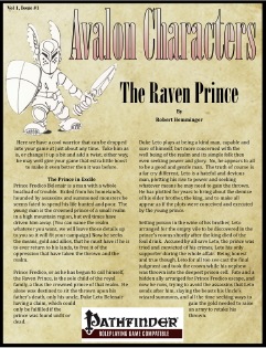 Avalon Characters Vol 1, Issue #1: Raven Prince (PFRPG) PDFAvalon Game CompanyA deposed prince, and a friend to the PCs... or is he? Need something to spice up your game, but you are all out of ideas? Well, Avalon Game’s Pathfinder Roleplaying Game series is here. Yep, we have done all the work for you, so all you have to do is run the game. Use Avalon Characters as a one-off encounter for your players, or as a reoccurring NPC, one which will add fun and excitement to your game time after time. Even better—each character is designed to be used as a Play Character Background should you feel like adding their story to your game. Versatile and fun, this and other issues in the Avalon Pathfinder Roleplaying Game line are sure to fulfill your gaming needs each and every time. Don’t wait—get all the characters you will ever need and come sit at the Round Table of Fun with Avalon Games. Product Availability