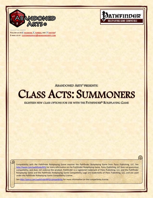 Class Acts: Summoners includes sixteen new evolutions (including 1-, 2-, 3-, and 4-point evolutions), and two new feats designed specifically for summoners.