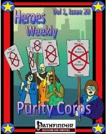 Heroes Weekly, Vol. 1, Issue #20: Purity Corps (PFRPG) PDFAvalon Game CompanyEach week Avalon Games offers a new issue of Heroes Weekly. Packed full of great superhero fun, each issue will offer a short adventure, an NPC, or some game mechanics for the Heroes Wear Mask system. While compatible with the HWM system, you can always use the information presented in each issue for other superhero games—just monkey around with the stats and mechanics to fit the system you are using. Some anti-mutant protestors turn into a real threat for mutants of all kinds. Don't miss an issue, they are super! Product Availability