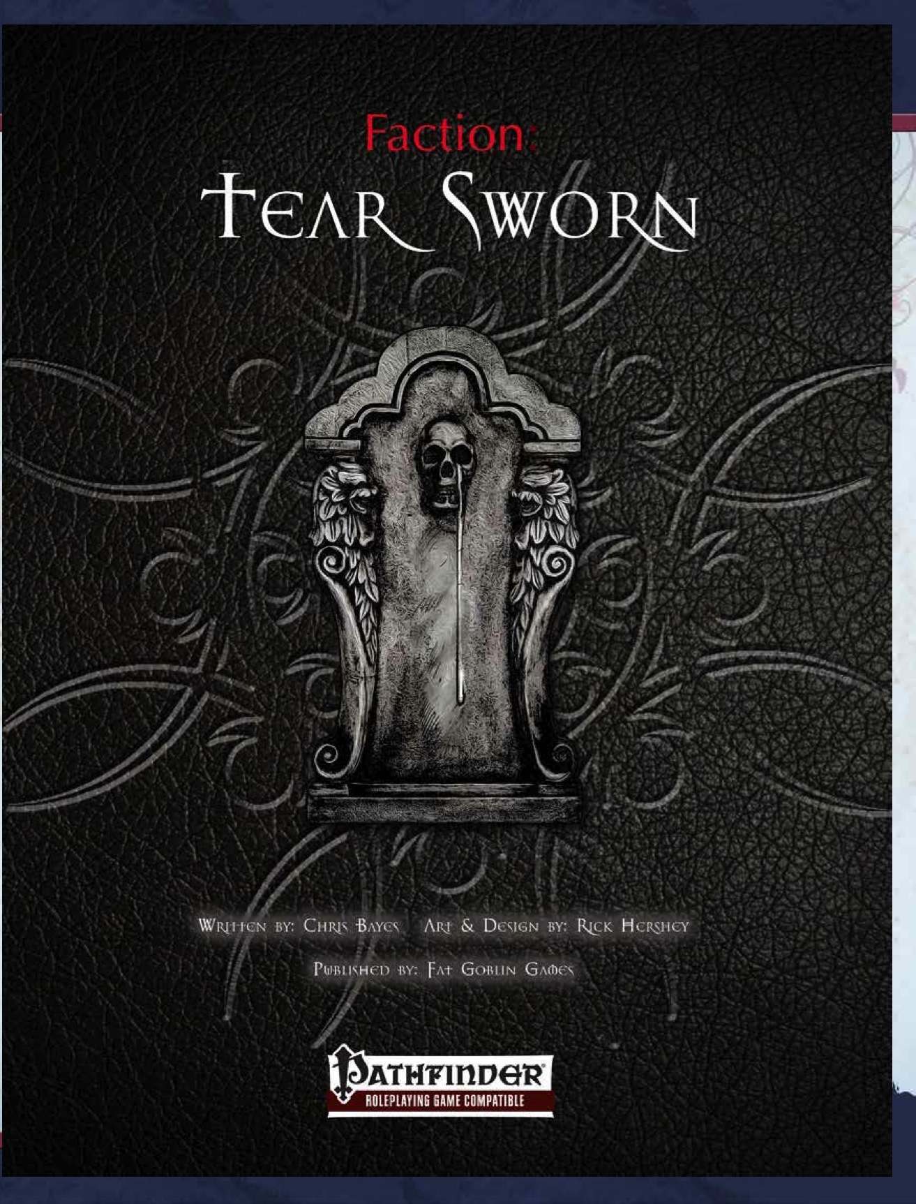 It is from such an experience, though not atheism (considerably harder to maintain in a world where gods grant magic...) that the Tear Sworn have sprung forth, founded by a paladin and a survivor of a horrid massacre (which is detailed in an extensive piece of introductory prose), they are unified in the experience of having had to witness a loved one rise again. They are the guardians of the sanctity of the dead, an order of Lawful good hunters of the undead and stewards of the grieving., led by paladin/holy vindicator Gabriel Stoddard, the write-up provides information on good (and less common) class choices for members before going into the details of their headquarters (a church in a graveyard, obviously), information on joining the faction, etc. The ceremony and secrecy requirements are comparatively lax, considering that the faction operates in the open and three sample missions, provided as brief sketches, can guide an enterprising GM in the creation of thematically-appropriate adventures.