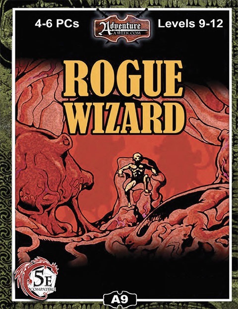 5E A09: Rogue Wizard (5E) PDFAAW GamesA 5th Edition compatible adventure for four to six PCs of levels 9-12 The party have a straightforward charge; bring in a rogue wizard! This adventure takes the PCs into a wizard tower crowned by a strange alien life form. A blob of flesh encapsulated in a chitinous shell firmly grips the sides of the tower with long tentacles which also crash through many of the tower's windows. Every room of the tower presents a different challenge for the PCs who must fight and think their way through many dangerous and odd situations. After a multitude of obstacles the PCs must confront a series of guardians the likes of which they have never before seen; and all of this before they come face to face with the infamous "Rogue Wizard". Also included in "Rogue Wizard":