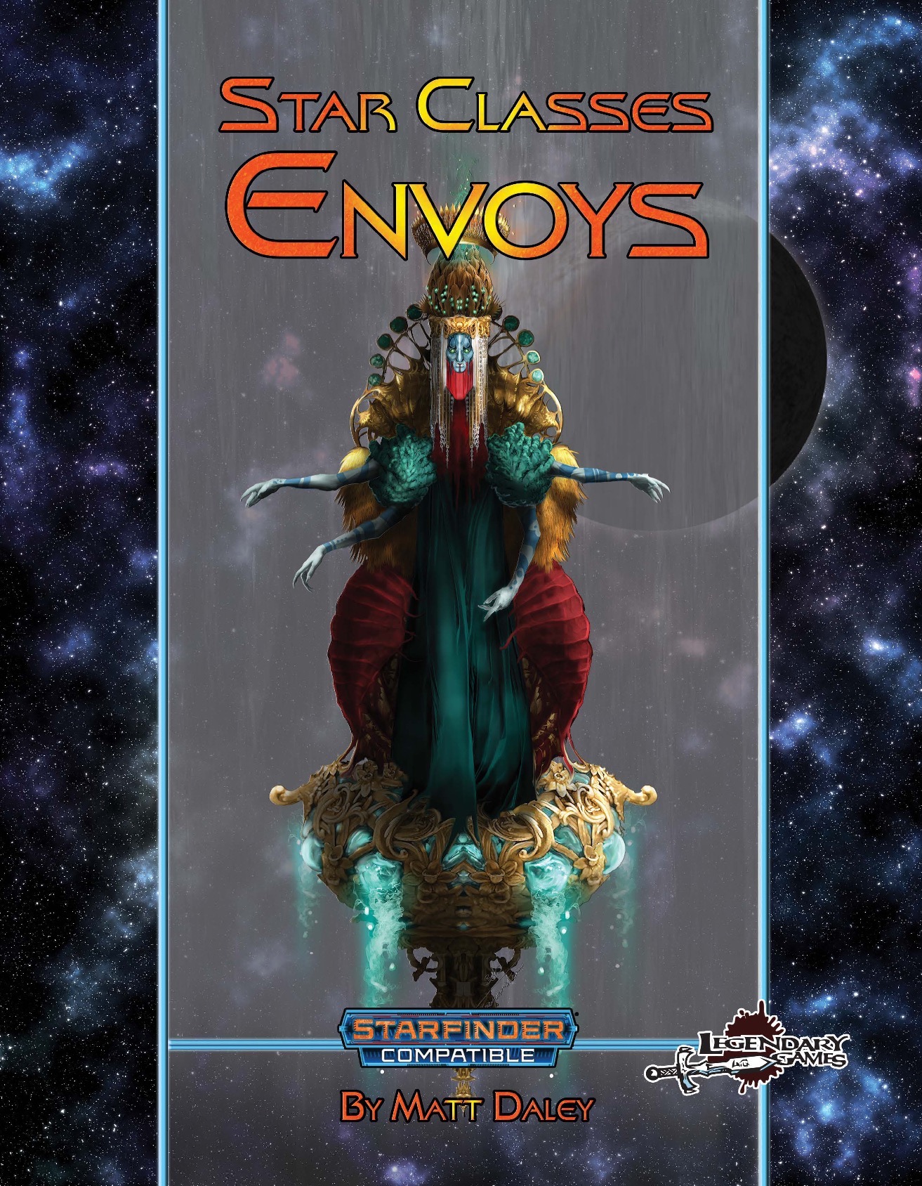 Star Classes: Envoys is the latest volume in our new series of class-focused player supplements expanding the possibilities the spacefaring classes of the Starfinder Roleplaying Game! Engage in verbal sparring, subtle persuasion, and shouts of victory with over 70 new rules and flavor elements for envoys, including new feats for combat and conversation along with expanded skill uses for Bluff, Diplomacy, Intimidate, and Sense Motive! You’ll find new improvisations like Ambush Savvy, Keep It Together, and Come and Get Me, alongside expertise talents like Wheel and Deal, Probe Intentions, and Planar Agent. You’ll also find a pair of archetypes in the multitalented Polymath and the Engram Channeler tapping into the literal ghosts in the shell! Plus, you get 6 ready-to-use envoy characters and creatures from CR 5 to 16 like the imperial ambassador and the alien tentacled telepath! Grab this fantastic 28-page Starfinder character class supplement by Matt Daley, Jeff Lee, Lyz Liddell, and Jason Nelson and Make Your Game Legendary!