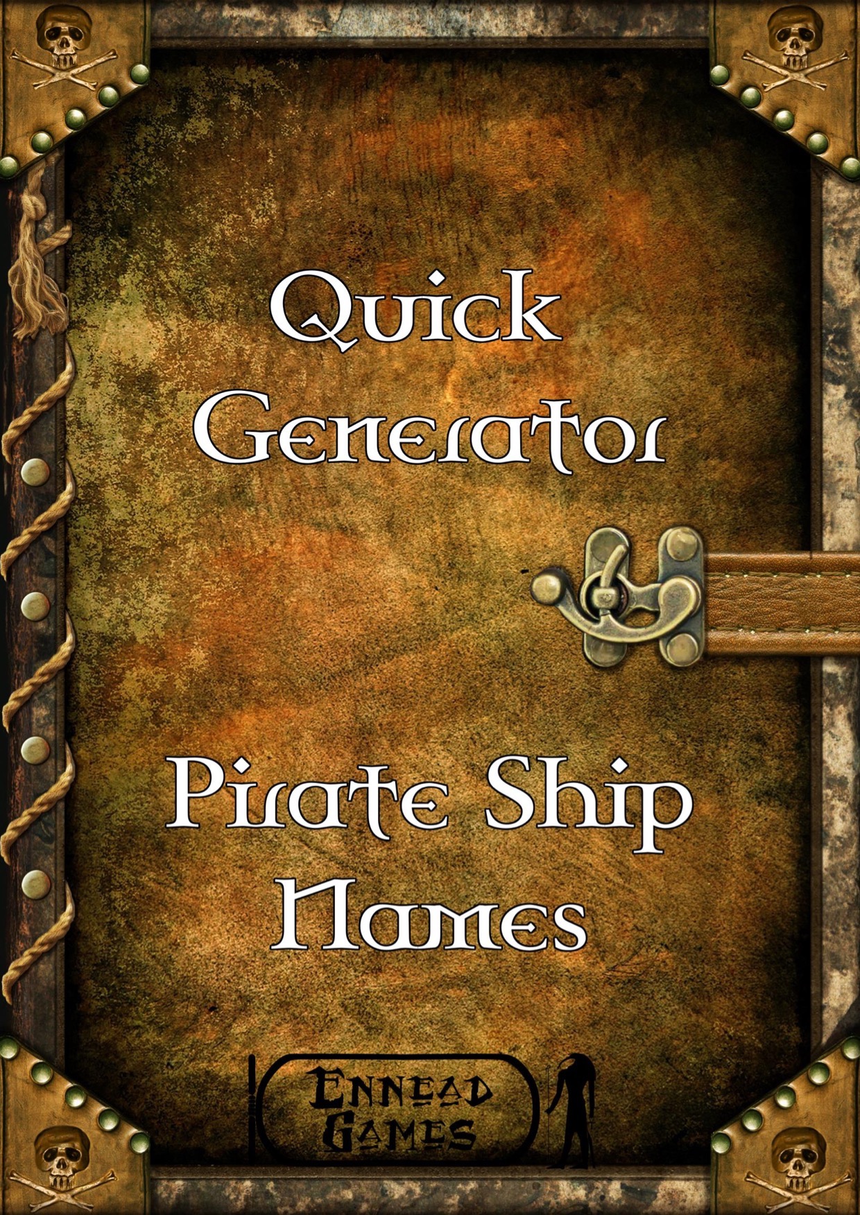 Quick Generator - Pirate Ship Names PDFEnnead GamesQuick Generator Pirate Ship Names When running a game or coming up with content for a story, you can sometimes be stuck for ideas and need inspiration quickly. The Quick Generator series is designed to help with that. At a maximum of two tables, you can come up with your required concept, suggestion or idea in a very small number of dice rolls. This particular QG is about coming up with a name for your pirate ship. Although there is nothing stopping you from using for others ships, the name parts have been put together in such a way as to make the name sound like a ship a pirate would be proud to serve on. With 2 x d100 tables and 10,000 possible combinations, such as...