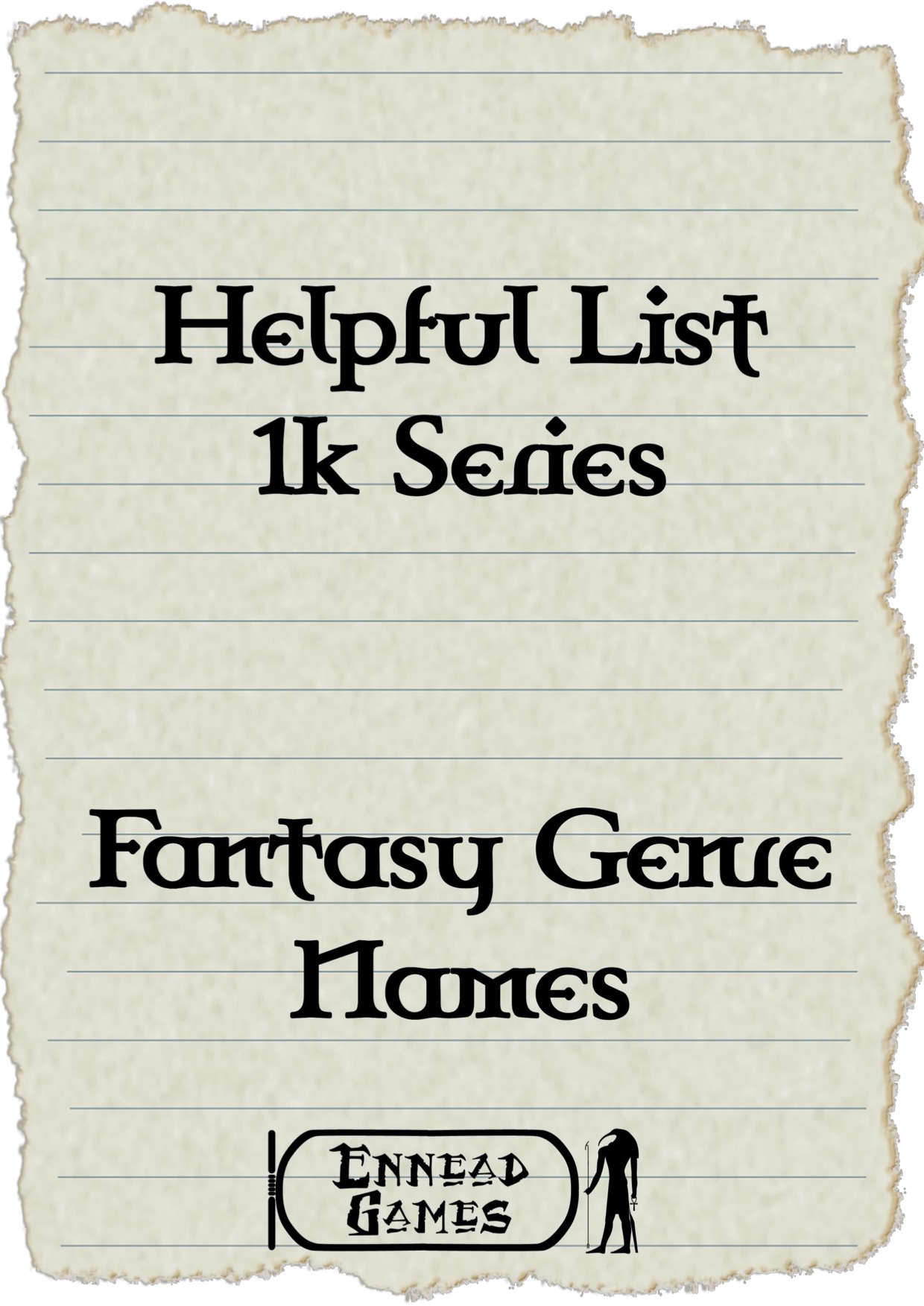 Helpful List 1K Series Fantasy Genre Names PDFEnnead GamesHelpful List 1K Series Fantasy Genre Names The Helpful List series is designed to give you, as the name suggests, a list of various things that you might mind helpful. They all follow the same basic format of at least 1d100 table, sometimes more depending on the nature of the subject. The 1k series takes this a step further, with 10 1d100 tables themed around a certain subject broken down into their own tables of 1d100 each. This particular Helpful list series covers the so-called classical fantasy genre race of dwarfs, elf, gnomes and halfling, with Old English being used to represent the stereotypical “Medieval” humans The names listed herein are not in the species or cultures natural language, but have been translated into the common tongue for ease of use. The tables cover...