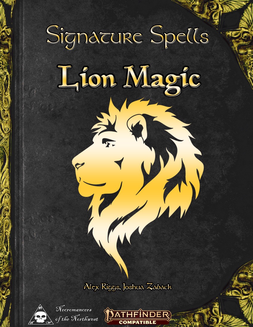 Signature Spells - Lion Magic (PF2E) PDFNecromancers of the NorthwestKing of the Jungle, King of Magic! Knowledge is power, especially when that knowledge relates to casting spells. With a wide and wonderful world of magic out there to explore, a spellcaster's repertoire of spells not only allows them to do fun and exciting things, but can also help represent and define who they are and what kind of magic they are wielding. The Signature Spells series, for the Pathfinder Second Edition Roleplaying Game, provides exciting new spells with strange and unusual abilities, all linked to a specific theme. This book focuses on spells relating to feline creatures, and lions in particular. In addition to simply conjuring, speaking with, and influencing cats of all descriptions, you'll also gain access to the sorts of traits that associated with lions, both literal and metaphorical, including the ability to grow a flaming mane, the power to inspire courage, and a series of spells that can be cast separately or all together at once which allow you to deliver incredibly powerful and debilitating roars that are truly worthy of the king of beasts! Product Availability