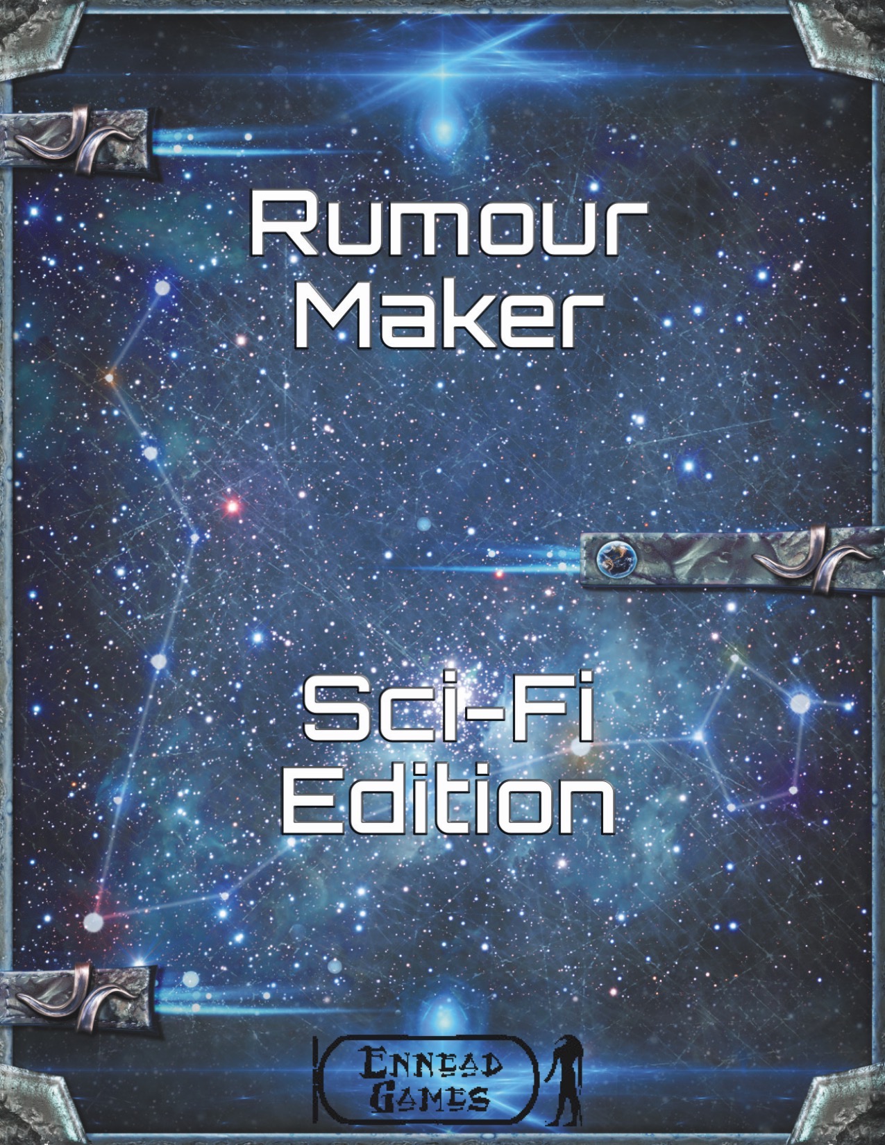 Rumour Maker - Sci-Fi Edition PDFEnnead GamesRumour Maker — Sci-Fi Edition Rumours are the source of many adventures — They can tell you about possible intrigue, fabulous riches, or tall-tales. In worlds of a fantastical-nature, they can be heard in taverns, from passing bards and so-on. A science-fiction based setting has its version of this, from spaceport with travellers from across the galaxy to scoundrels looking to con a gullible rube out of their credits. The Rumour Generator — Sci-Fi Edition is designed yo help you come up with some rumours, who they were heard from, what juicy gossip they cover and how true, or not, they are. Featuring: