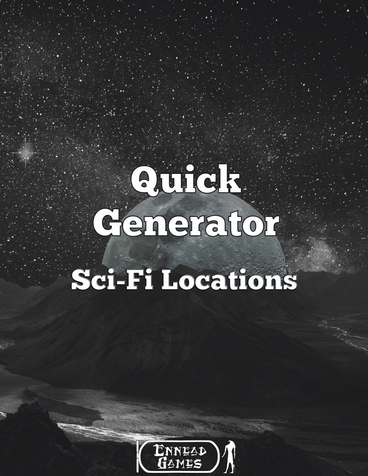 Quick Generator Sci-Fi Locations PDFEnnead GamesQuick Generator Sci-Fi Locations Where is your mission located? Many science fiction based games and worlds feature maps, news reports that mention a location, orders that tell you to go to one particular place and deal with the problem there and so on. You might have names for the star system or planets and now just need something to cover a particular location or area. From stations to docks, to enclaves and havens, this PDF gives you a system for generating simple names and concepts for features that might be found on maps in sci-fi, or modern-adjacent, settings. With 10,000 possible combinations, you are sure to find something that sparks your imagination! Example outputs include...