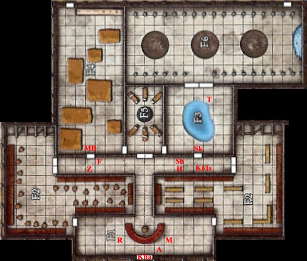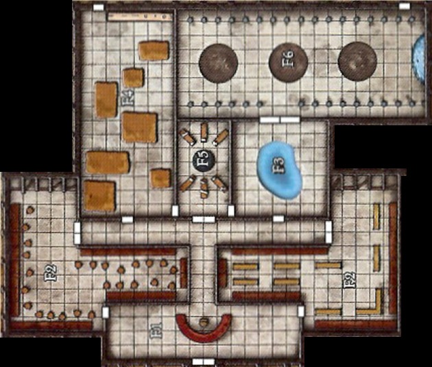 Holdrus charges forward, but the skeletons close ranks, attempting to prevent him from moving forward (Strength check 1d20+3=20). Shenker darts forward and stabs one of the skeletons, but his blade passes into the open ribcage of the undead ineffectually. Taking advantage of Holdrus’ lead, Skarsnikt cartwheels through the trio and lands before the door taken by the Templar. Peering inside the humid room, the mantis man can see a stone tiled chamber dominated by a large pool in the shape of a sun, bas-relief rays extending to the walls around it. The templar wheels around from studying the runes of the door at your scuffling approach and again reaches for his holy symbol.