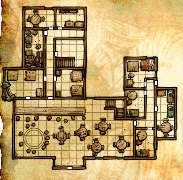 Layout of the Happy Cow. The stairs downstairs are currently blocked off. The bedrooms to the right used to all be staff quarters but now only two house staff and the other two are rented to visitors (one of these is where Kells is staying, the other is Auric's). The only room you're really aware of other than the taproom is the room with table & chairs in it in the NW corner - this is a private meeting room that you're welcome to use if it hasn't already been claimed by someone else (it is currently empty)