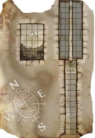 There is indeed a door just inside the mouth of the angry face. Through the gaping mouth is a long, dark room with no floor. A three-foot-wide beam of petrified wood spans the chasm, leading straight ahead into darkness. About ten feet below the beam, countless iron spheres the size of large oranges form an irregular floor, but it's impossible to tell if they're a wholly solid surface. The nortwest and southeast walls (the walls to the left and right of the beam) are covered in a honeycomb of geometric patterns. A featureless stone ceiling extends about twenty feet from the beam.