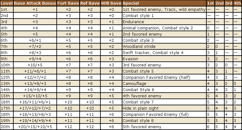The ranger’s class skills (and the key ability for each skill) are Climb (Str), Concentration (Con), Craft (Int), Handle Animal (Cha), Heal (Wis), Hide (Dex), Jump (Str), Knowledge (dungeoneering) (Int), Knowledge (geography) (Int), Knowledge (nature) (Int), Listen (Wis), Move Silently (Dex), Profession (Wis), Ride (Dex), Search (Int), Spot (Wis), Survival (Wis), Swim (Str), and Use Rope (Dex).