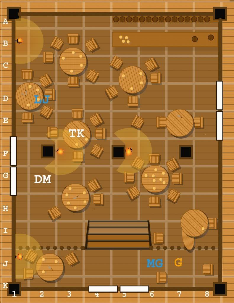 The halfling monk leaps to another table (D2) and pegs the drunk monk with a spinning kick. 2
