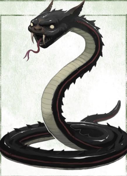 Reeling from the bite, Gierixa brings her scimitar down with both hands, landing a severe blow to the side of the creature. Fully uncoiled, it might be as long as a human is tall; thanks to the grotesque addition of a goblin head on the thing, the shock of intense pain is visible. Gierixa recognized the creature as a Goblin Snake, as horrible as a Goblin, but stupider, these aberrations are sometimes worshipped by some Goblin tribes. What this one is doing in the swamp is a mystery to you. Additionally, they can communicate and command regular snakes, and are often accompanied by them. When distressed, they can belch out an intoxicating and putrid blast at foes.