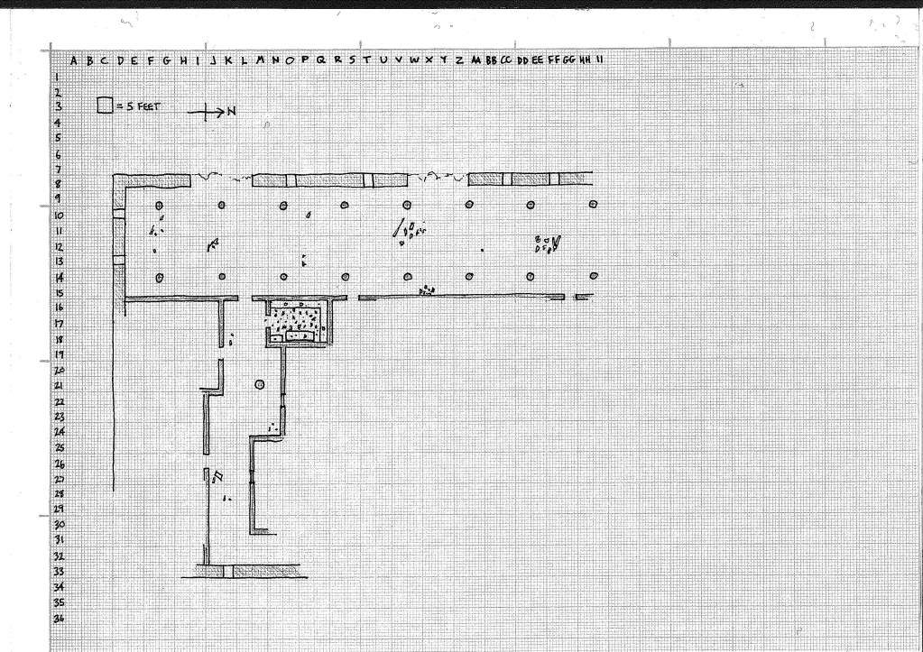 Here is a map of the ruin as you have so far explored it. The kitchen where the pugwampis were is at N16 to Q18, with the entrance at N17. The remaining sleeping pugwampis is on the bench at P16 and the other disappeared down below the benches at Q18. The door that the baboons came out of is at N22, and the statue of Sarenrae is shown at M21.