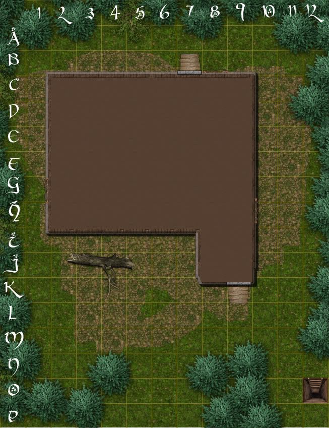Listening intently at the top of the ladder Sturdy hears nothing going on outside. With a loud creak the hatch opens and once he looks around he sees that the opening comes out between a few trees and about 30 feet in front of him is a small meadow containing a wooden cabin.