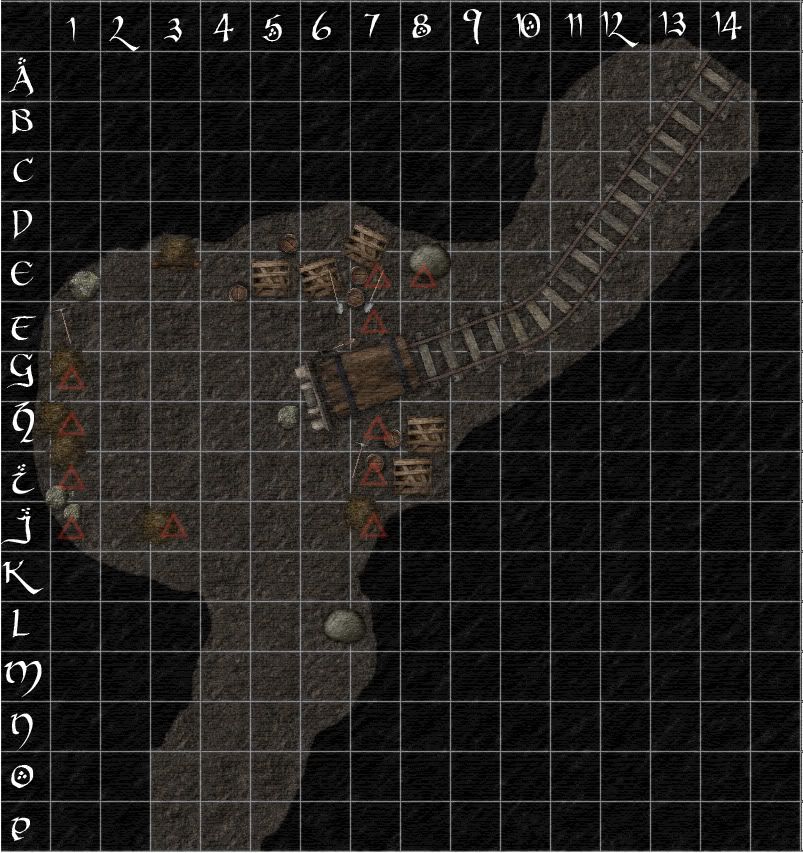 The adventurers move forward, stepping over the rubble from the opening of this crudely crafted tunnel. It is pitch black, thankfully the torchlight allows you to see enough to move through it safely. The walls curve sharply around solid stone. Eventually you come to an opening which houses a Cart with supply crates stacked nearby, a track leading down a tunnel and a Ladder that leads upwards to a hatch.