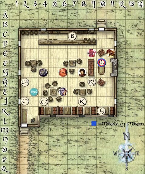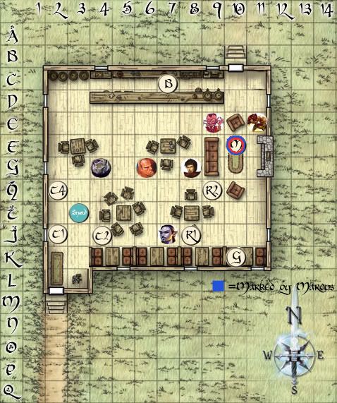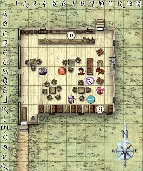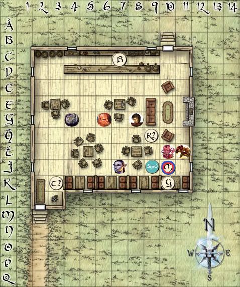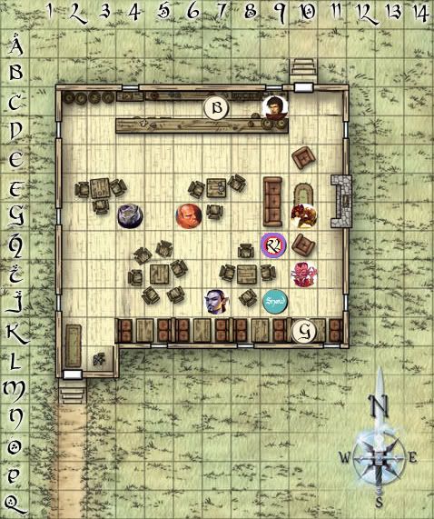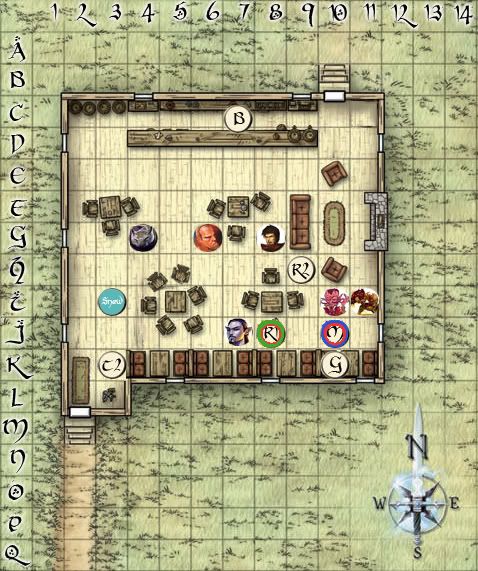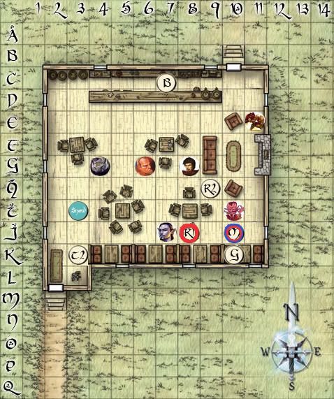 Across the room the two thugs by the front door leap into action, the first tries to swipe at Snow with his club but realizes quickly that his strikes are useless as they pass right through the creature. The second thug on the other hand, shifts past the creature and tries to club Aglaeca but the swing comes down to the right of the tiefling. After seeing his friend fall so quickly from an explosion of shards the last thug runs over to gang up with his friends, and possibly use them as shields. T4 double move to h2