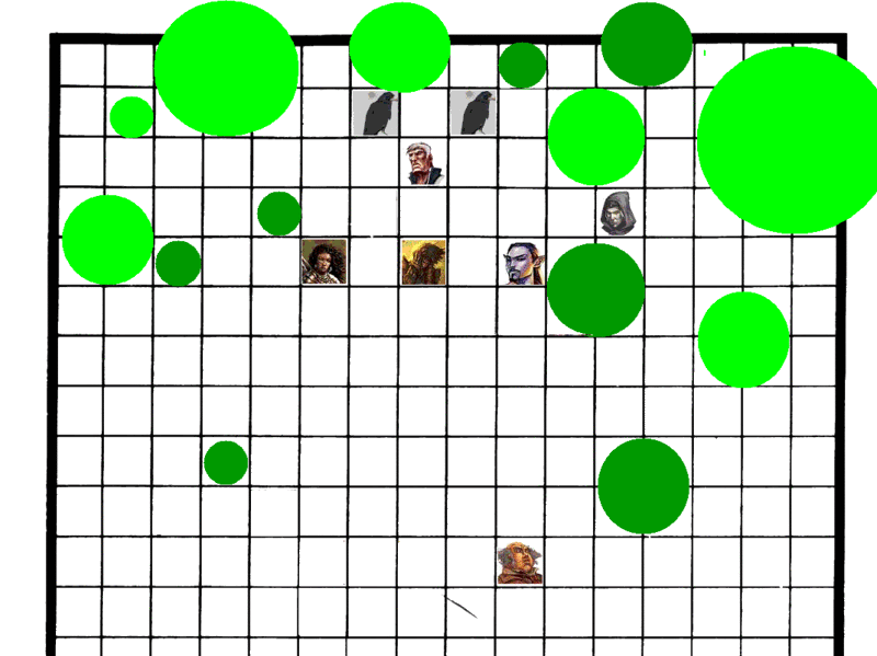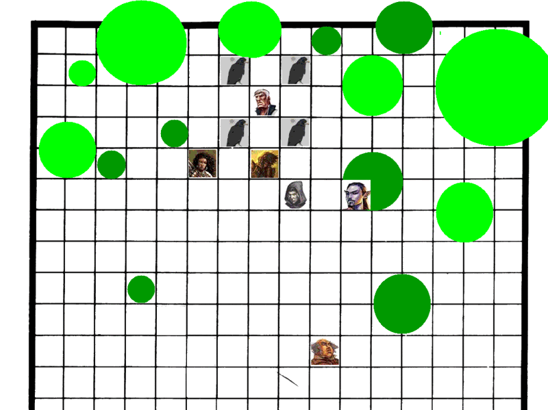 Lacore moves in closer to Torillan and the birds, but not so close that he can reach out and touch one of them. Deelin's arrow sails over his fleeing target while Dirk tries to catch up to the hobgoblin. Torillan swings wildly at the angry flock, but fails to hit anything; Daegan's dagger also misses it's mark. The large crows continue their assault on the warrior, and he feels each and every talon dig into this head and neck, nearly tearing his throat out (7 dmg total). Dorsera misses on her attack and Binjion prepares for his.