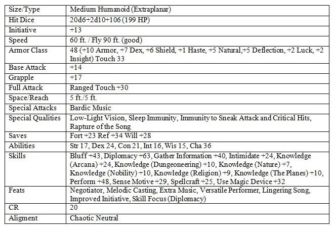 I *think* that I used his vanilla stats plus a Belt of Battle with 12 charges, 2 greater rings of counterspelling (greater dispel magic loaded), another "anti-magic banner" (identical to the one that Arendagost has in Chapter 11) and a big fat pile of crafted contingent spells.