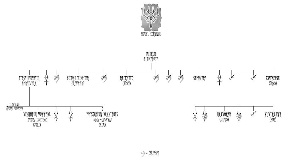 After a strange army of drow, angels, and things from beyond the stars besieges their House, six powerful dark elf nobles must flee Zirnakaynin. Can they escape what unnatural things pursue them? Can they set aside their own familial rivalries and personal demons long enough to survive the wilds of the Darklands? Can they discover the reason for the mysterious alliance of their enemies, and turn it to their advantage?