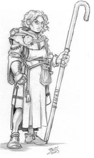 Brother Maynard is a young acolyte of the priesthood of Sivanah, goddes of riddles. Sivanahs followers are an odd and reclusive bunch, studying the world and trying to unravell its secrets. Brother Maynard was left on the doorstep of a Monestary of Sivanah late one fall evening. The Monks inside took this curious package in and debated on what to do with it. Half the brothers voted that raising the child would be a great experiment on intense intelecutal training and the human mind. The other half of the brothers voted that the child should be left inb a cave with wolves to see if wolves really could raise a human baby. One brother voted to roast the baby and eat its brains with orange marmalade, to see what those Mind Flayers were really going on about anyway. Fortuantely in the end, he went over to the side of the "raise the child in the Monestary" faction.