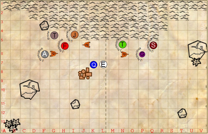 Guessing Tania killed the nearest sea scorpion; in that case, Quariel moves to N6 for the following action