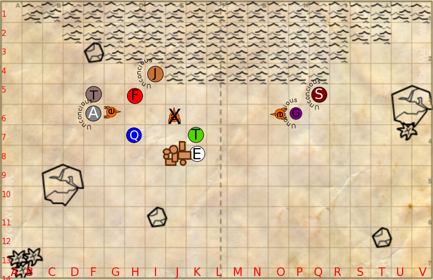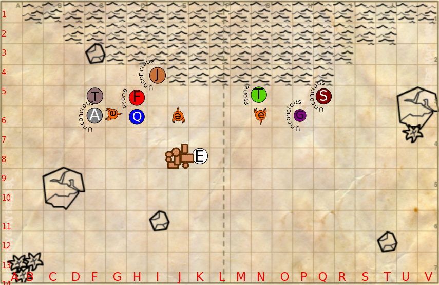 (13) Quariel frantically digs through the pile to find his favored weapon, cursing fluently in Elvish as his right hand bleeds freely. Once armed, he moves over to Fi'Vannali, hoping to help the other elf. As he steps away from gear the sea scorpion behind him strikes again.