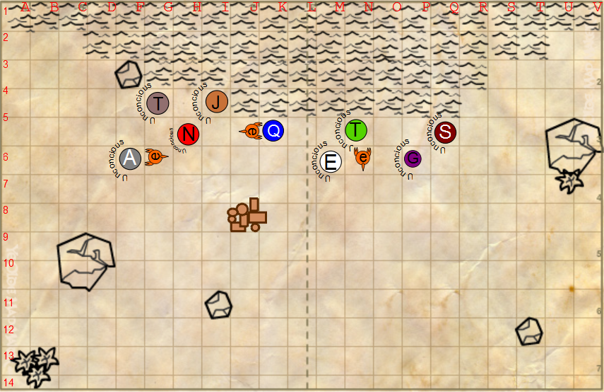 Looking around the area reveals an early morning beach with several other unconscious people laying in the surf. There are three of the lobster scorpion creatures including the one that just snipped him several times. Quariel moves over to the pile of goods nearby. Perhaps in a moment he can find his trident.