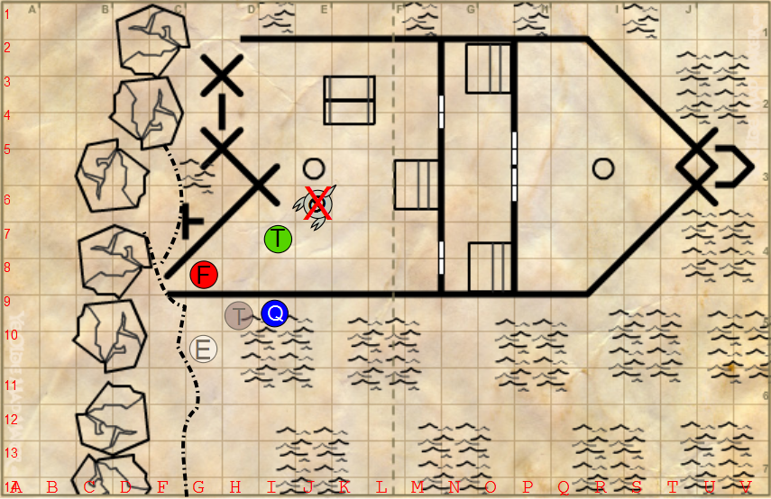 (13) Giving up on helping the others, Quariel leaves them to grab the rope and simply tries to swim away from the shore, hopefully to a lower portion of the ship he can grab or climb up. With the rope wrapped around his arm he makes it into the shattered remains of the galley.