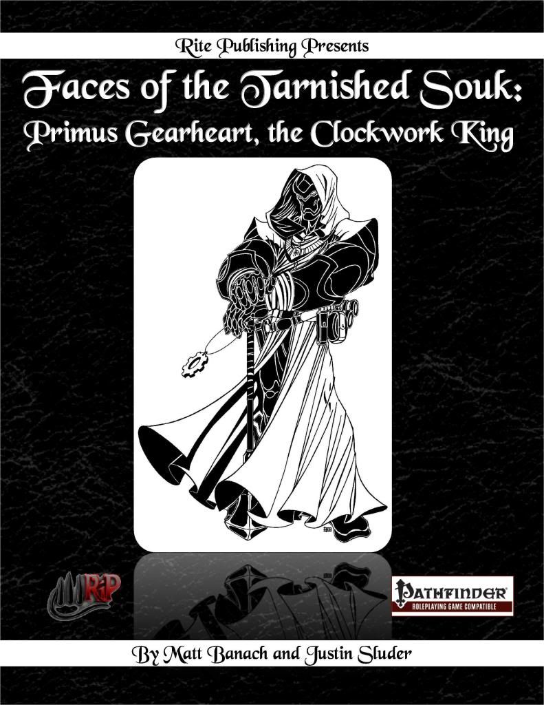 Faces of the Tarnished Souk: Primus Gear Heart, the Clockwork King The provides Game Masters with details on an evocative and intriguing character, ready for immediate use in any campaign - but especially for use within the Coliseum Morpheuon. Each entry features ingenious stat-blocks from multiple OGL sources, history, motivation, secrets, and insight into the NPC’s most carefully guarded dreams, along with complete game statistics for low, middle, and high levels of play. Within you will find: