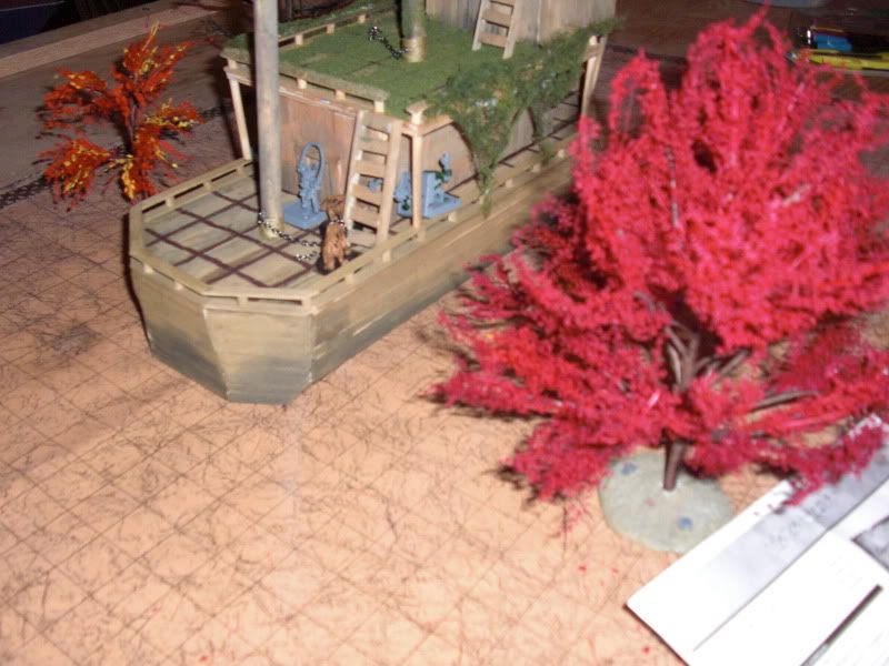 Mogmurch finally makes it up on the deck, not noticing a vine that wiggled itself loose as he ascended the gangplank. The horse finally enters melee from across the open area as Poog unleashes a fire bolt at the creature, scoring a hit (another boon from Zarongel). Chuffy moves into position and draws the Gorge of Gluttons while Reta engages the horse and deals a solid hit with her dogslicer.