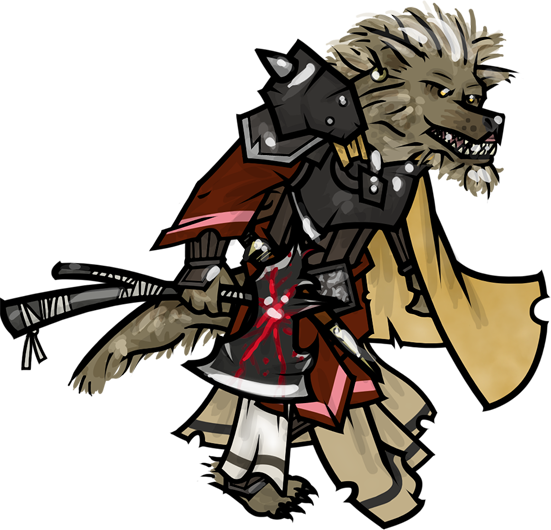 She wears a heavy iron breastplate that is stained with blood and salt, and bears a tattoo given to her in her youth: A ring of black flame surrounding her right eye, which symbolizes the burning gaze of Gorum. She carries a longbow in addition to her primary weapon, and prefers to leave her arms bare so that her enemies can be intimidated by the sight of her bulging muscles.