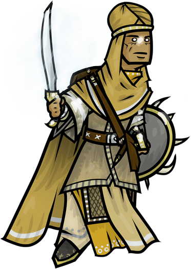 Short version: A proud and cocky desert nomad who aspires to become knightly and urbane. An athletic and handsome warrior, he is, regardless, still rough around the edges. He's the "moldspeaker," with the last remnants of a genie's spirit riding in the back of his mind, and he carries an ornate scimitar covered in biting frost.