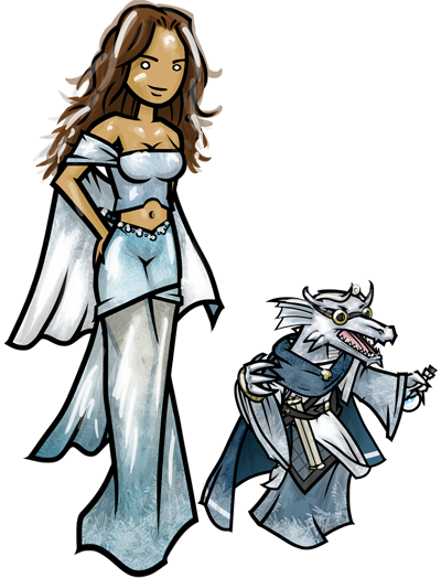 Another artist, Ashton Sperry of paper miniatures fame, was kind enough to illustrate these characters for me (in a very different style) a few levels back, but hey, I love seeing different artists' viewpoints. I don't know if you'd rather see those illustrations for sake of reference or avoid them for sake of creative freedom. Either way's fine by me.