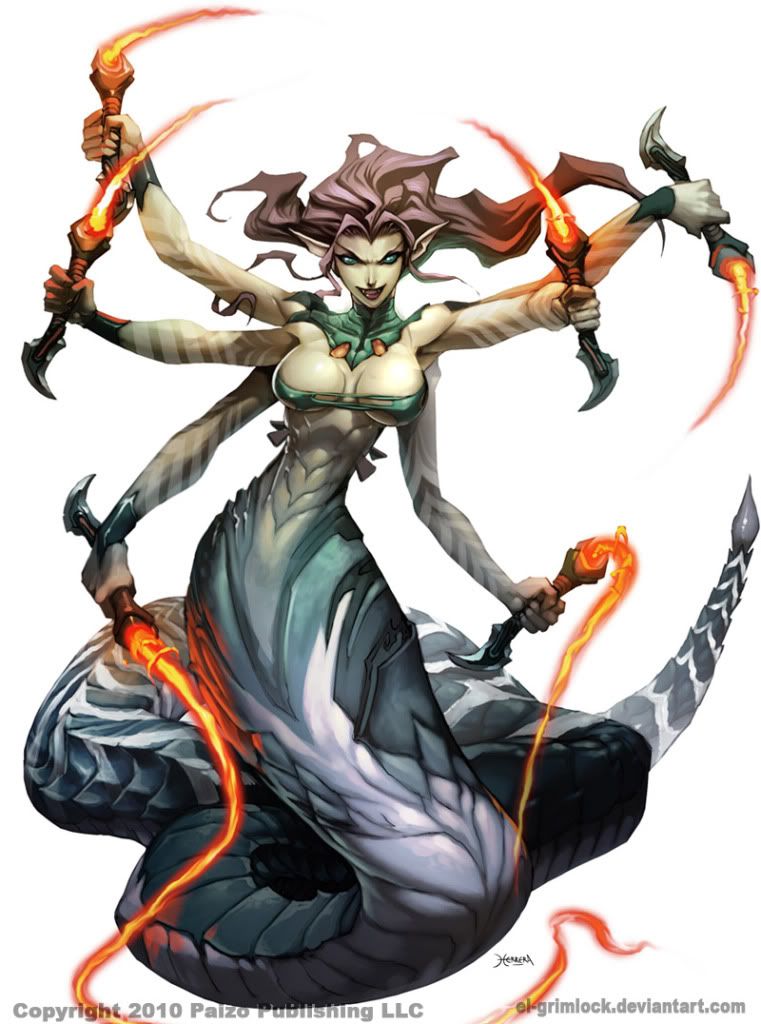 Here's Siri, dubbed by the drow "The Serpent Queen", daughter of Zuhra Aponavicius. I've never run a synthesist before, but it works well for the concept and should at least be powerful defensively. I envisage her as a secondary combatant and secondary arcanist, probably dropping a spell before getting into combat. She should also make an incredible face, since she should be rocking a diplomacy in the low twenties.