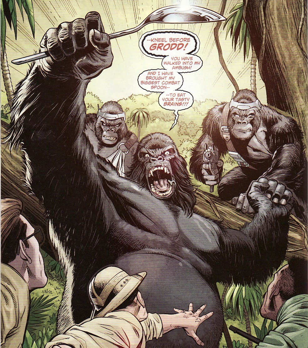 TarSpartan wrote:There is also the famous panel from Action #893 (right before New52 started) where Grodd holds up a spoon bigger than his head and proclaims "Kneel before GRODD! You have walked into my ambush! And I have brought my biggest combat spoon to eat your tasty BRAINS!!!" My son couldn't stop laughing for ten minutes the first time he saw that panel.Thank you, Google!