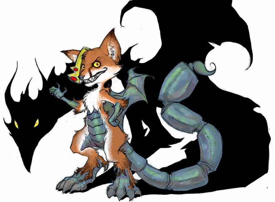 Tegresin the Laughing Fiend hangs in space, held up by his own shadow by the scruff of his neck, and it becomes more obvious to you as not simply a shadow, but a very real, very tangible and quasi-independent thing, vaguely draconic as it looms above its tiny, smirking physical corollary. Simultaneously, both the shadow and the fox-headed fiend chuckle.