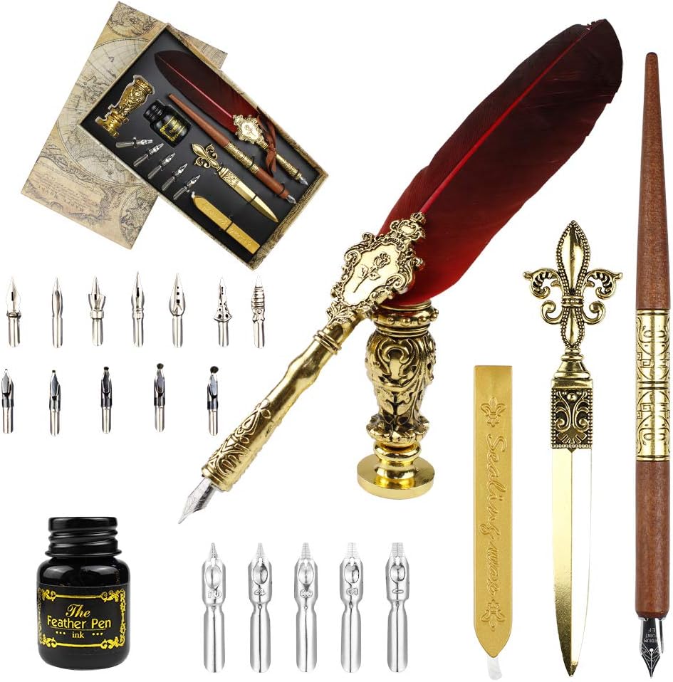 The inkpen has a lacquered body and barrel with gold trim, the lacquer changes colour to match the colour of the ink being produced. Each inkpen comes with 5 gold nibs that can be inserted into the barrel for different widths of lines when writing or drawing with it as well as a case to carry the inkpen and nibs in.