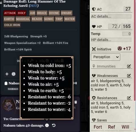 - If you have a trait like Holy being applied, apply that resist/weakness only once to the entire attack (because the outcomes become absurd if you apply Holy weakness four times when someone uses a flaming corrosive shock weapon).